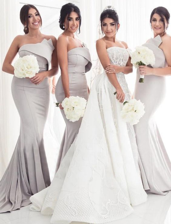 Mermaid Strapless Grey Satin Long Bridesmaid Dress with Train