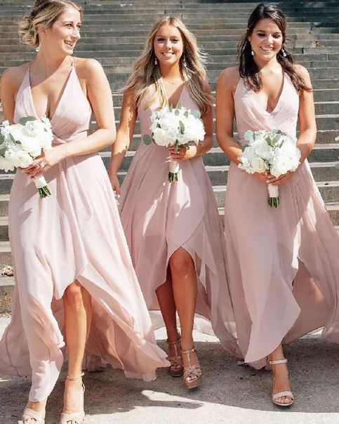 Simple A-Line Deep V Neck Halter Open Back Light Pink Chiffon High Low Bridesmaid Dresses Under 100