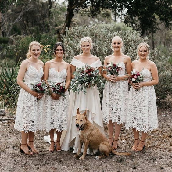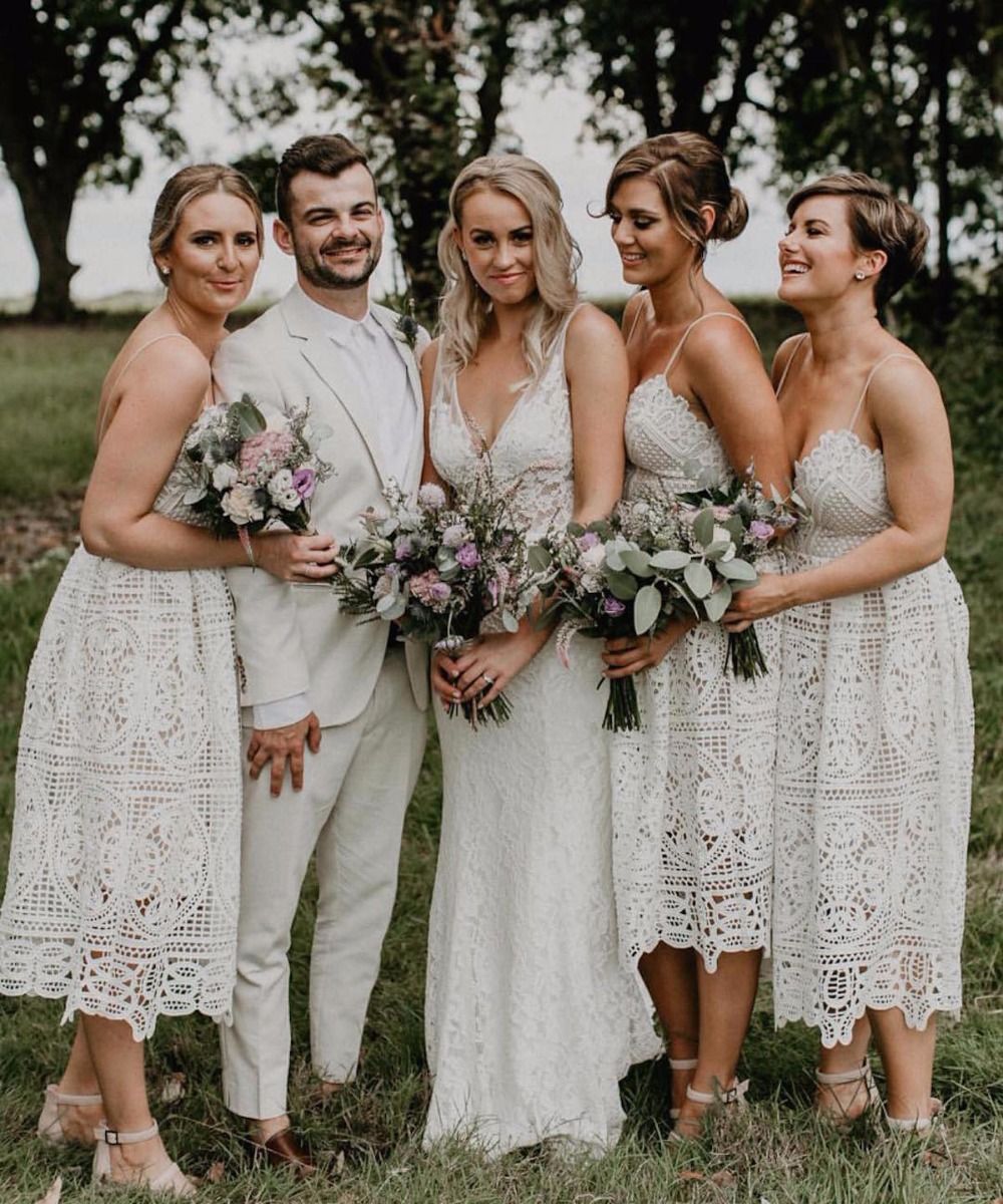 Boho V Neck Straps Lace White Bridesmaid Dresses