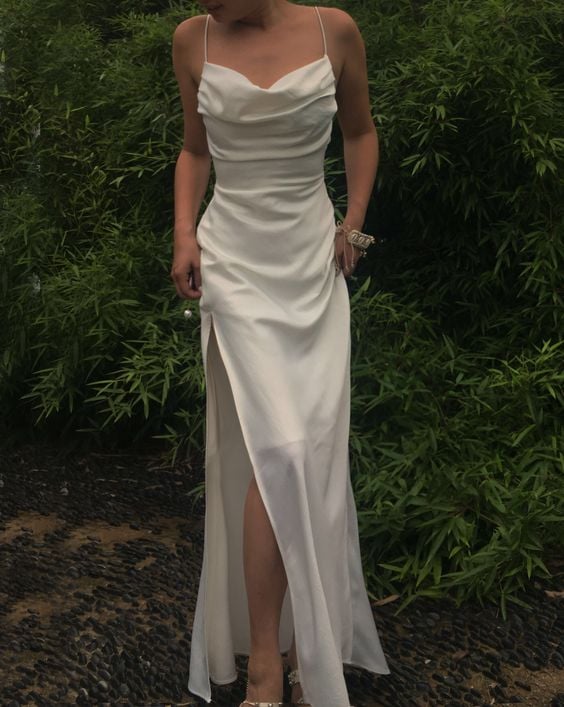 Sexy Mermaid Cowl Neck Spaghetti Straps White Satin Evening Party Dresses, Split Prom Dresses