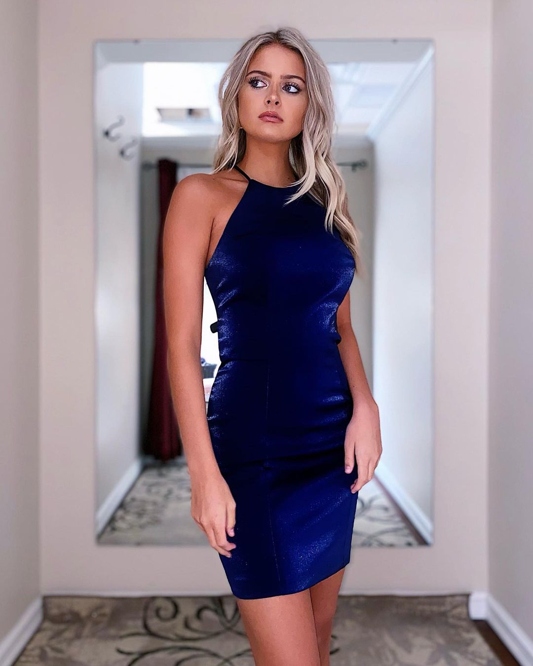 Cute Sheath Hatler Navy Blue Velvet Homecoming Dresses