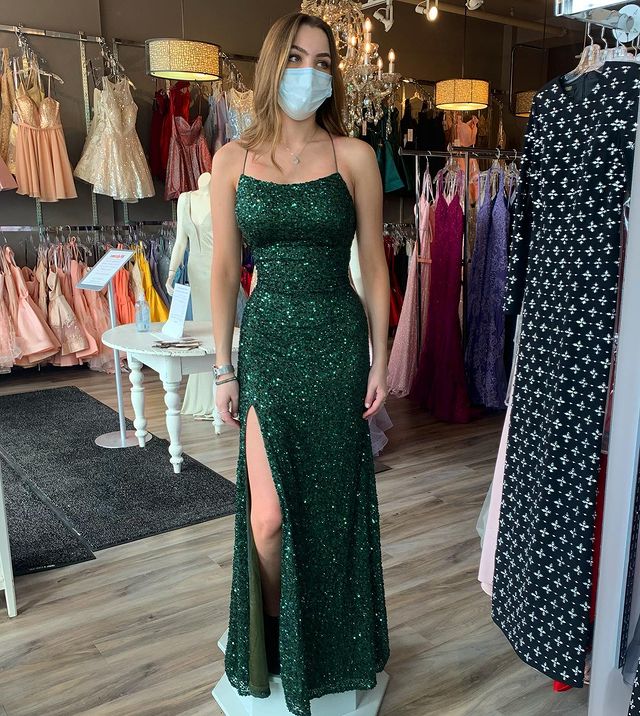 Sparkly Sheath Scoop Neck Dark Green Sequins Prom Dresses, Split Evening Dress