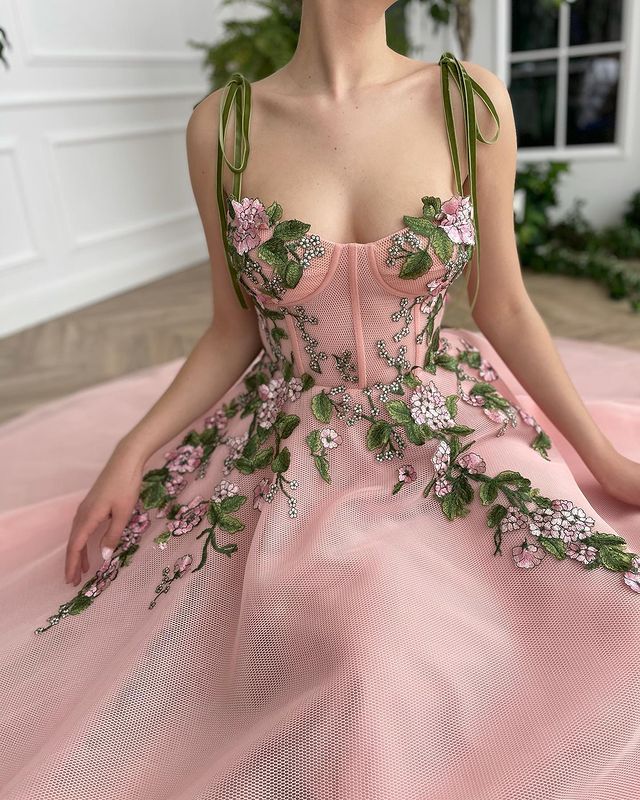 Cute Sweetheart Straps Pink Tulle Prom Dresses with Appliques