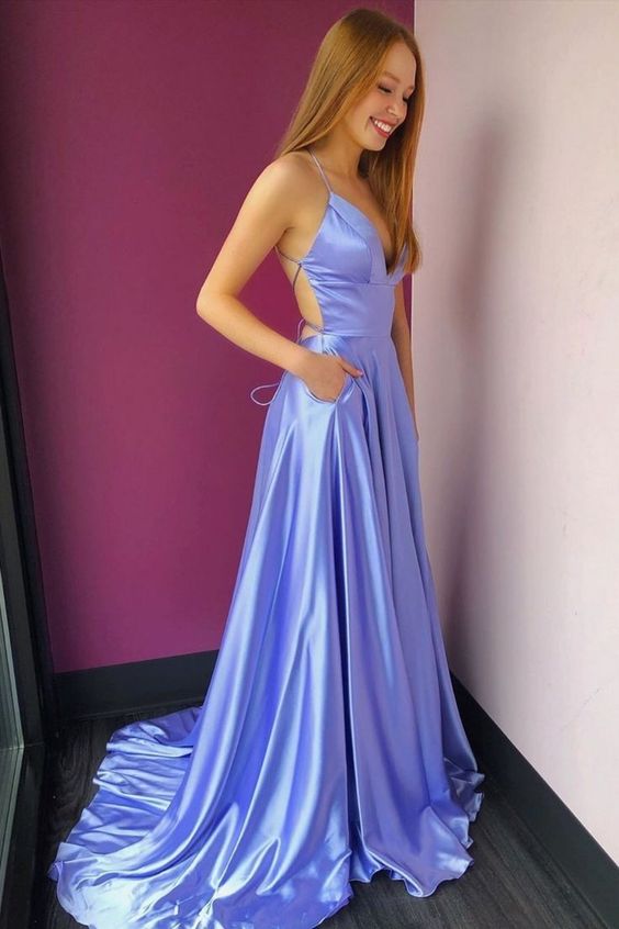 Sparkly A Line V Neck Lavender Satin Long Prom Dress with Pockets