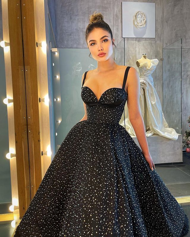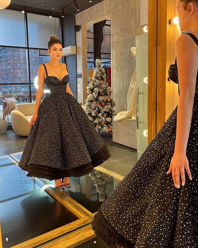Stunning A Line Sweetheart Sparkly Tulle Black Prom Dresses