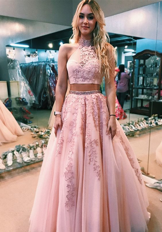 Two Piece High Neck Pink Long Prom dress with Open Back