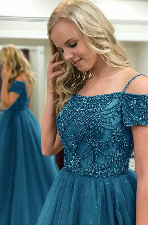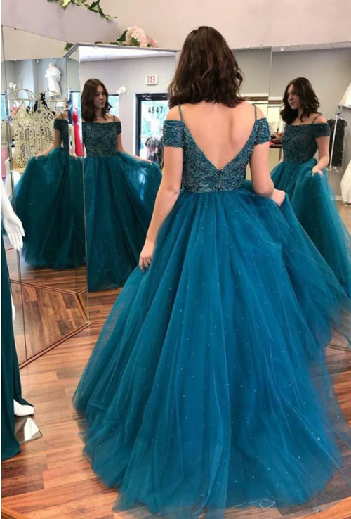 Ball Gown Off-the-Shoulder Dark Blue Tulle Prom Dress with Beading