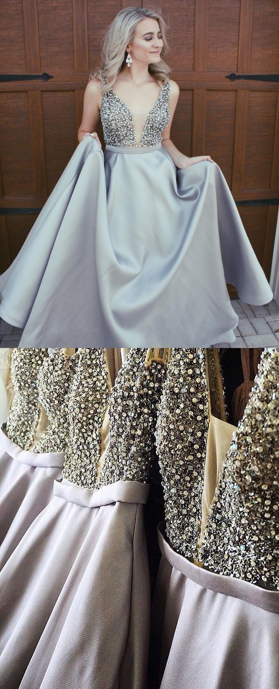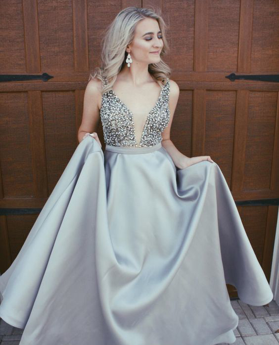 New Arrival Gorgeous V Neck Backless Light Grey Satin Prom Dress with Beading, Formal Evening Dress Custom Made