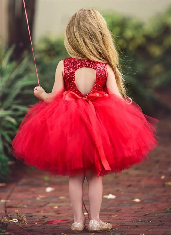 Cute Ball Gown A-Line Red Sequins Tulle Flower Girl Dress with Bow