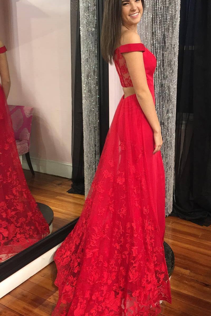 Elegant Off the Shoulder Red Lace Long Prom Dress with Side Split
