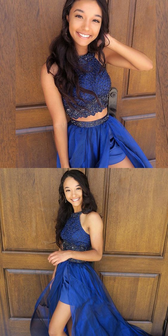 Charming Two Piece Halter Beads Satin Long Prom Dress,Royal Blue Evening party Dress