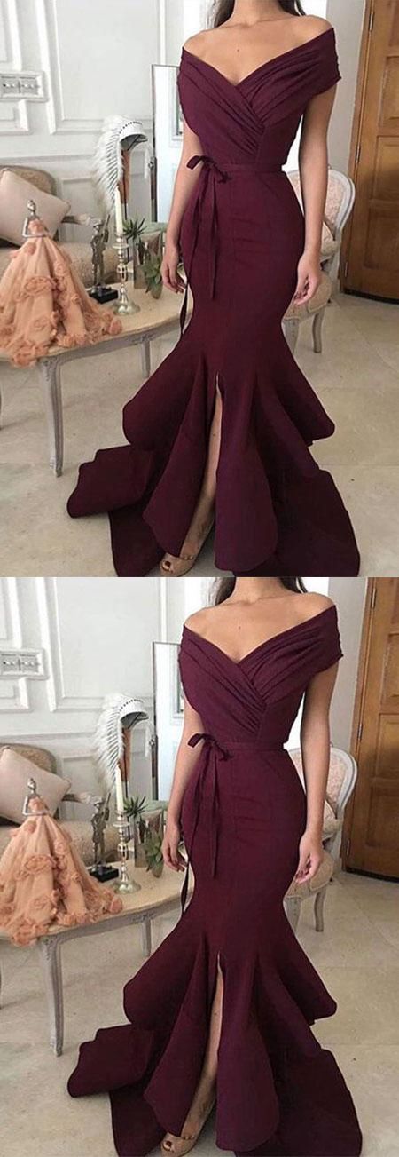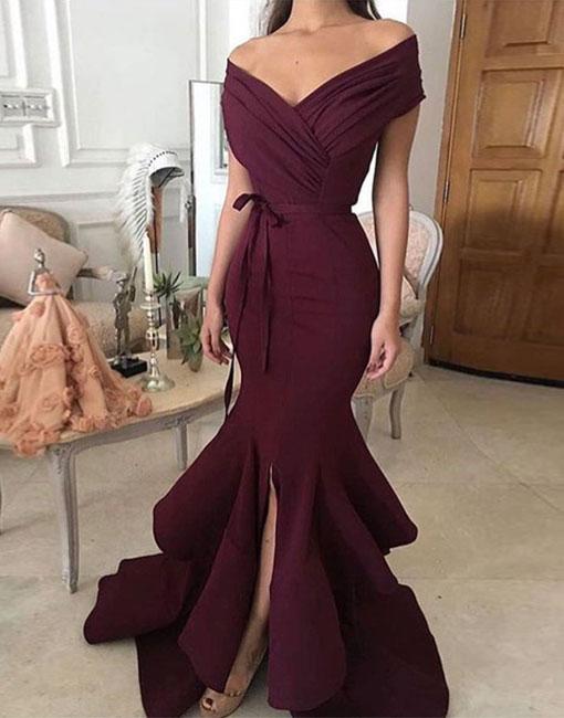 Charming Off the Shoulder Burgundy Satin Mermaid Long Prom Dresses