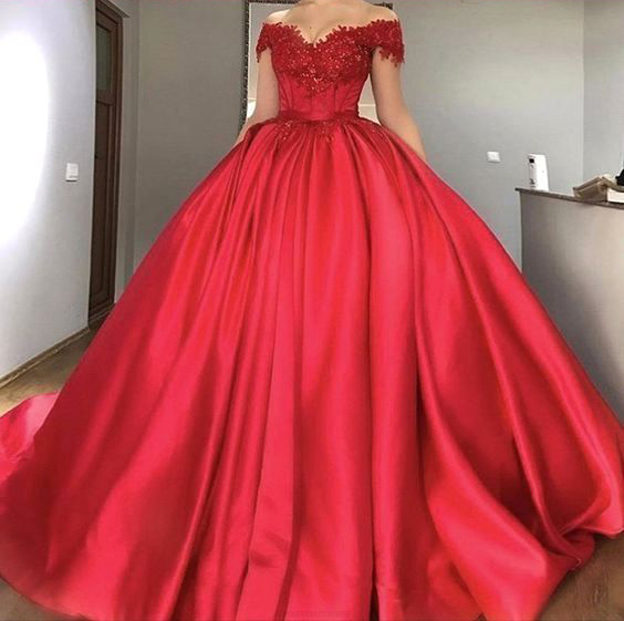Red Ball Gown Off the Shoulder Prom Dresses with Appliques, 2019 Quinceanera Dresses