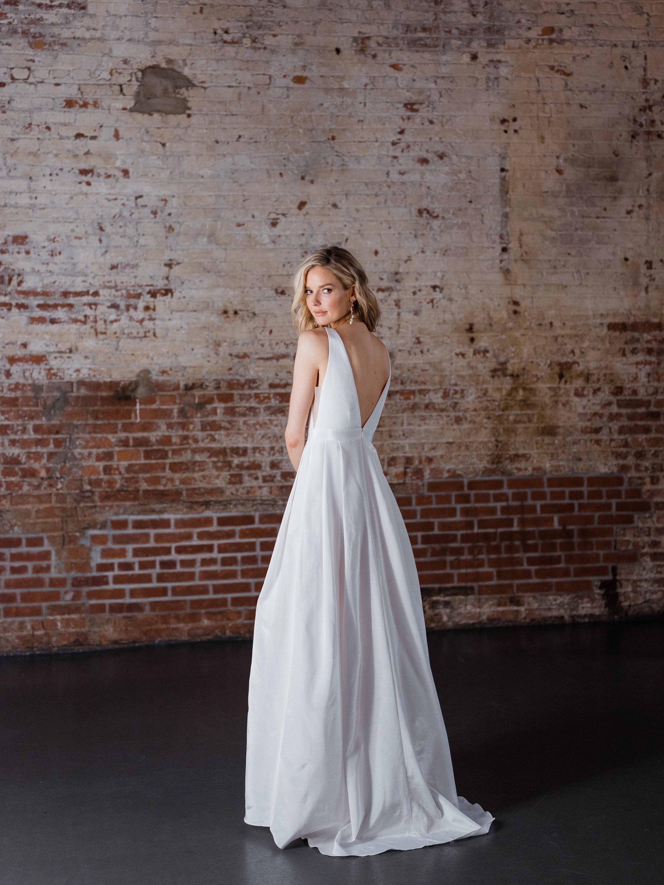 Simple A-Line Deep V Neck Open Back White Satin Wedding Dresses,2019 Wedding Gown