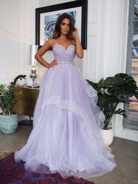 A-Line V Neck Spaghetti Straps Open Back Lavender Tulle Long Prom Dresses,Quinceanera Dresses