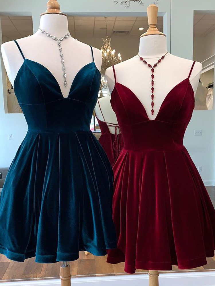 Vintage A-Line V Neck Cross Back Burgundy Velvet Short Homecoming Dresses with Pockets,Cheap Back to School Dresses