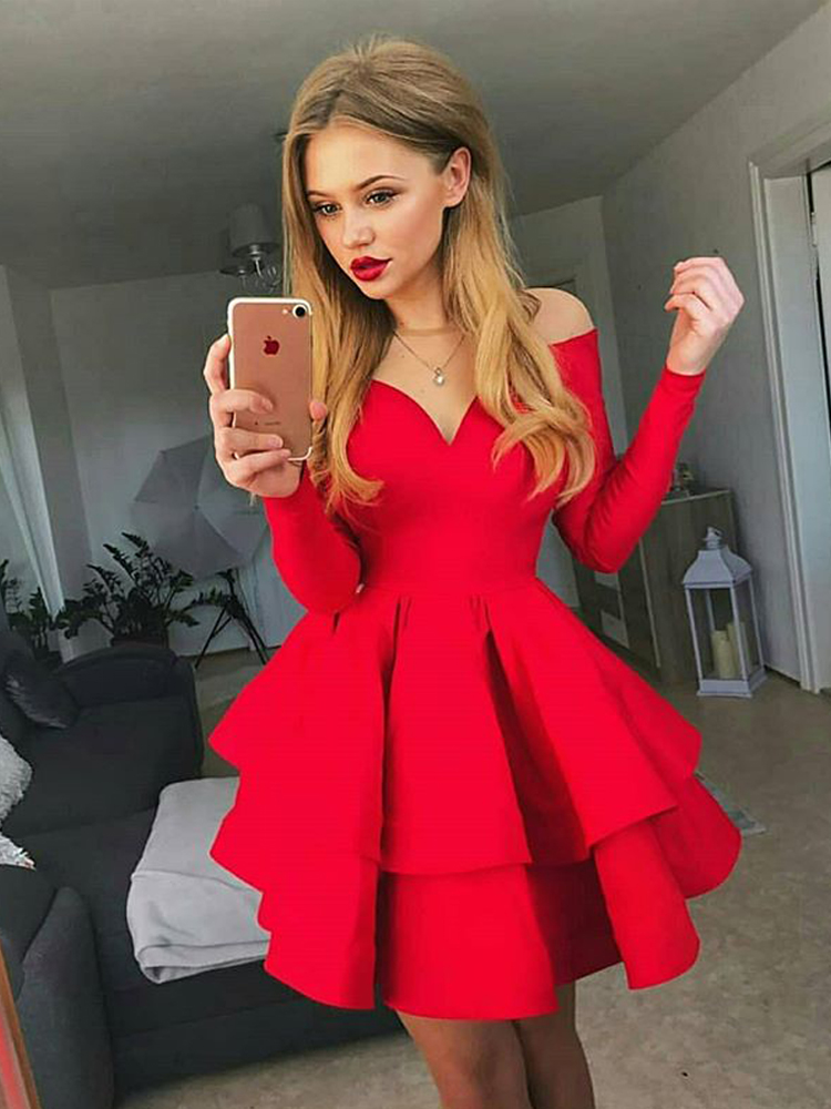 Cute Off the Shoulder Long Sleeves White/Red Short Hoco Dresses, Cute Short Party Dresses