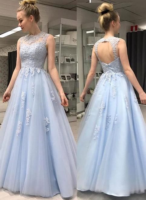 Charming A-Line Round Neck Blue Tulle Long Prom Dresses with Appliques,Formal Party Gown
