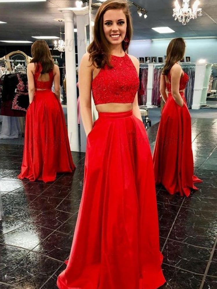 Unique A-Line Two Piece Round Neck Open Back Red Satin Long Prom Dresses with Beading Pockets,Formal Party Dresses