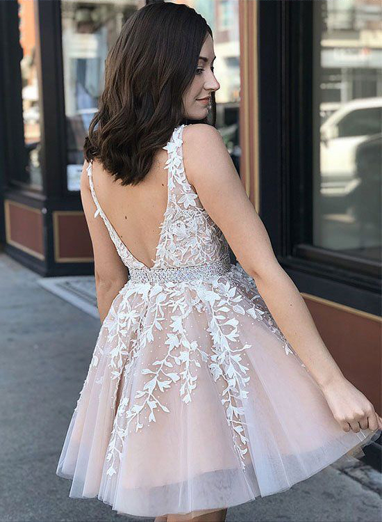 Cute A Line V Neck White & Blush Beading Homecoming with Appliques, Sweet Junior Homecoming Dress