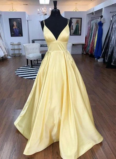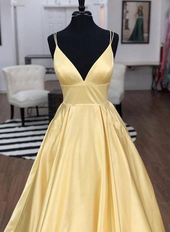 Ball Gown V Neck Spaghetti Straps Daffodil Satin Prom Dresses with Pockets