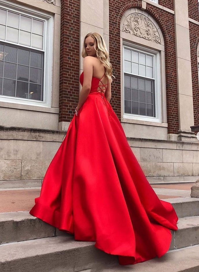Gorgeous Ball Gown V Neck Cross Back Red Satin Long Prom Dresses
