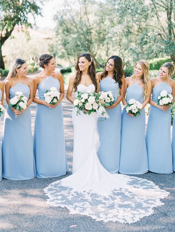 Elegant Sheath Halter Light Blue Long Bridesmaid Dresses for Wedding,Spaghetti Straps Bridesmaid Dresses