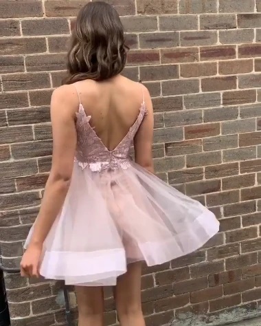 Cute V Neck Spaghetti Straps Blush Pink Lace Hoco Dress, Fashion Homecoming Dress