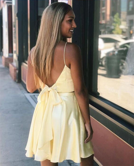 Cute A Line V Neck Two Piece Daffodil Satin Hoco Dresses with Bow Under 100