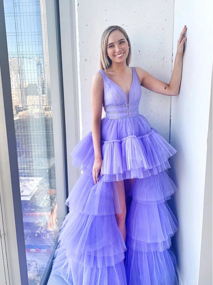2020 Fashion Lavender Tulle V Neck Layered Prom Dresses with Beading
