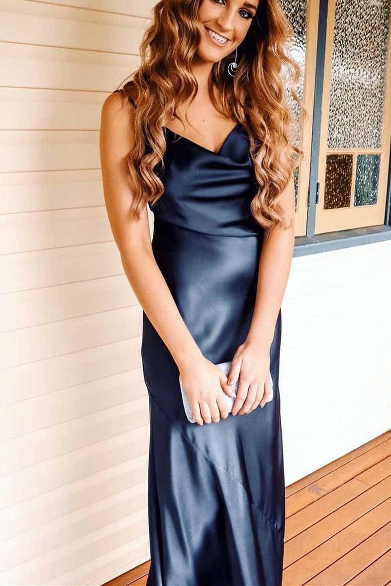 Chic Sheath Cowl Neck Spaghetti Straps Silk Satin Long Bridesmaid Dresses