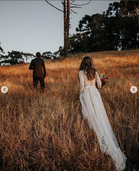 Bohemian & Fairy A Line V Neck Long Sleeves White Dot Tulle Wedding Dresses with Lace