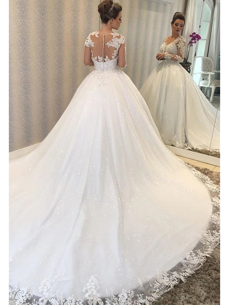 Ball Gown Sheer Neck Long Sleeve Lace Wedding Dresses,Lace Appliques Bridal Gown