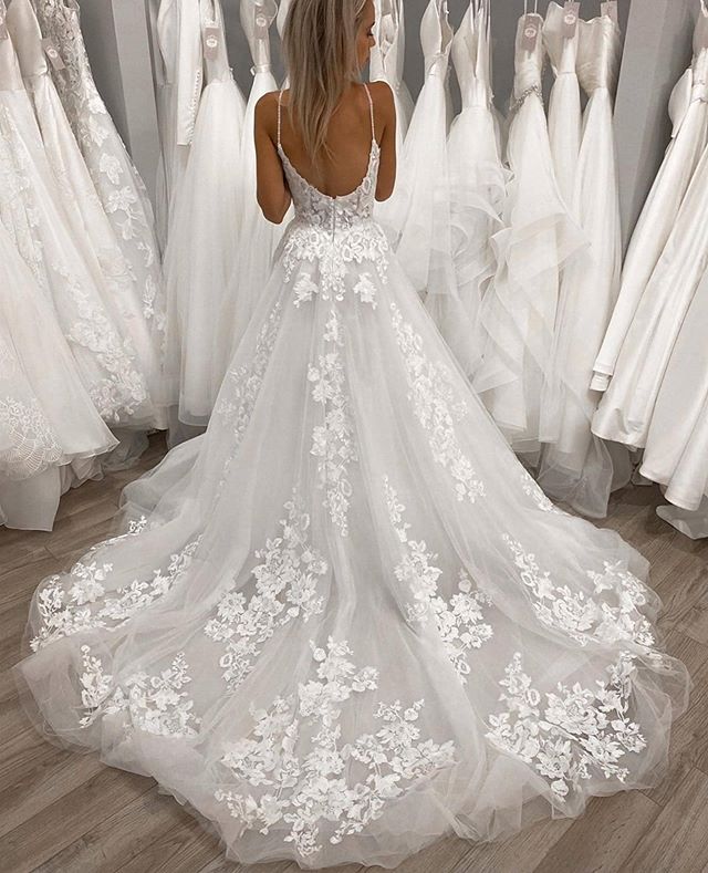 Gorgeous A Line V Neck Spaghetti Straps Wedding Dresses with Appliques
