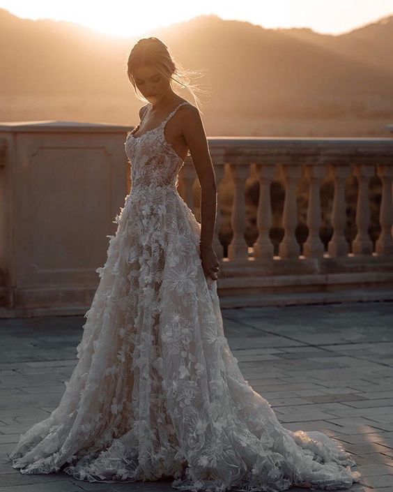 2021 Best Romantic Scoop Neck Ball Gown Lace Wedding Dresses with handmade Flower
