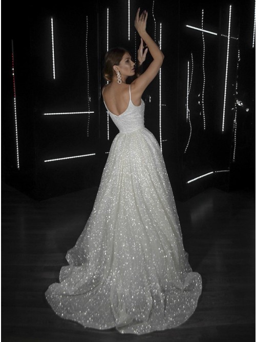 Sparkly Charming V Neck Straps Sequins White Wedding Dresses,Glitter White Prom Dresses