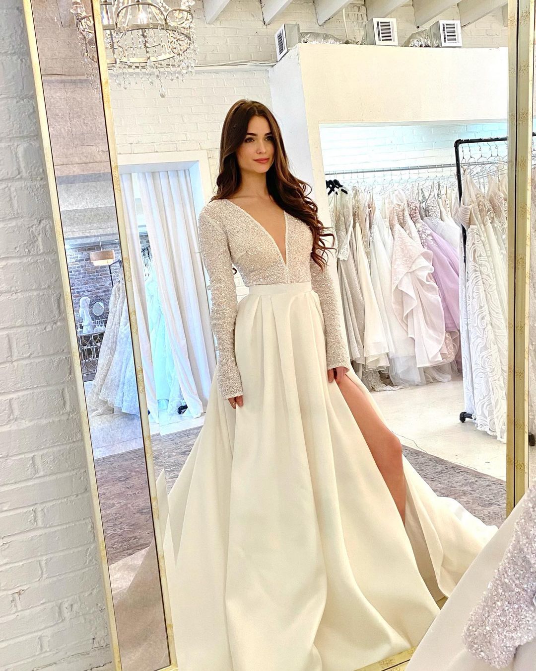 Sparkly Ball Gown V Neck Long Sleeves Satin Wedding Gowns