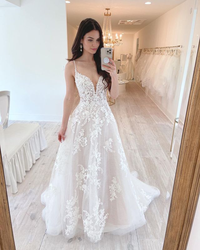 Sweet A Line V Neck Tulle Wedding Dresses with Appliques