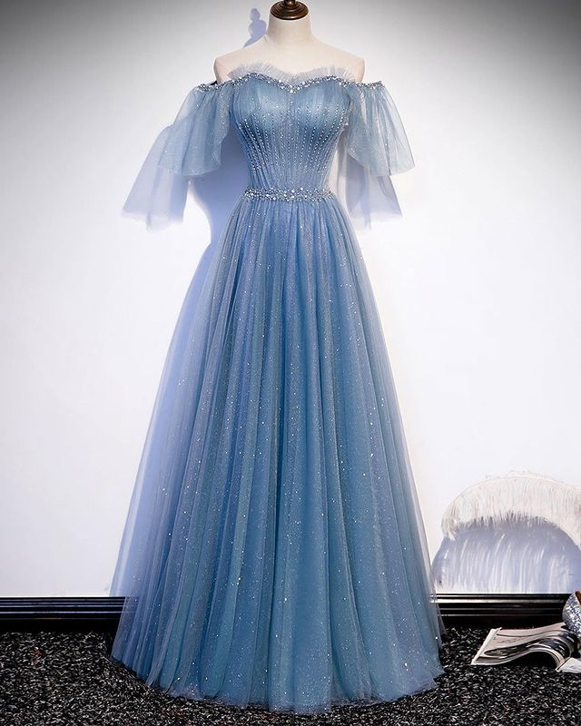 Sparkly Gorgeous A Line Off the Shoulder Dusty Blue Tulle Prom Dresses with Beading