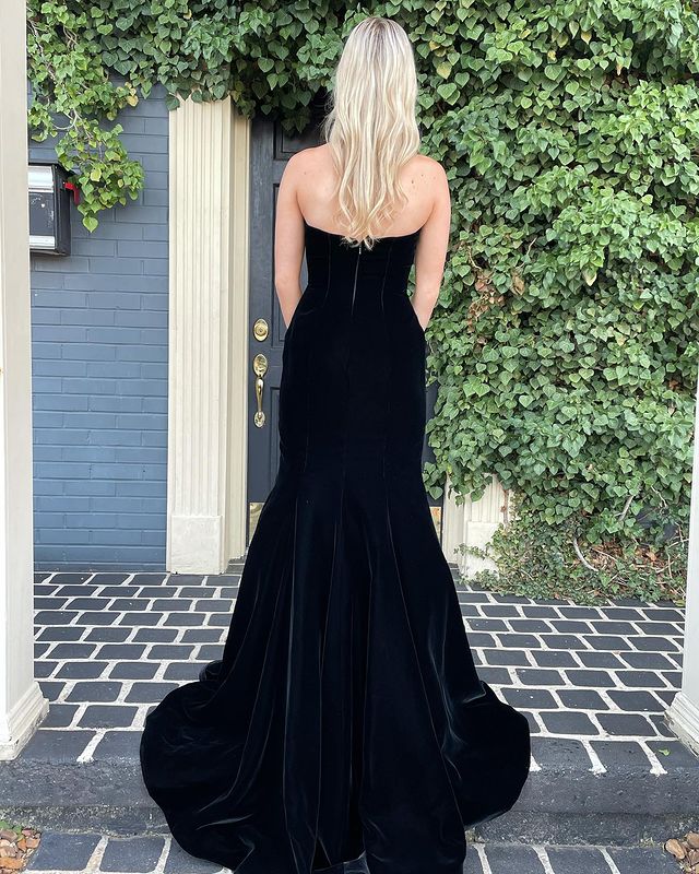 2022 Fashion Mermaid Black Velvet Prom Dresses with Train