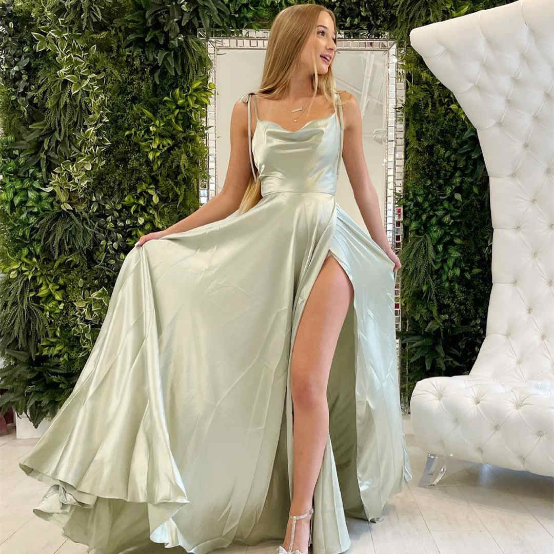 Sage Green Prom Dress with Spaghetti Straps, High Slit Senior Party Dresses