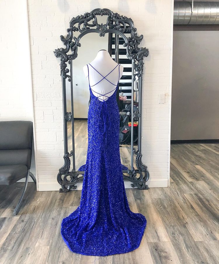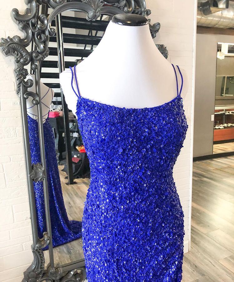 Sparkly Mermaid Scoop Neck Royal Blue Sequins Long Prom Dresses with Slit