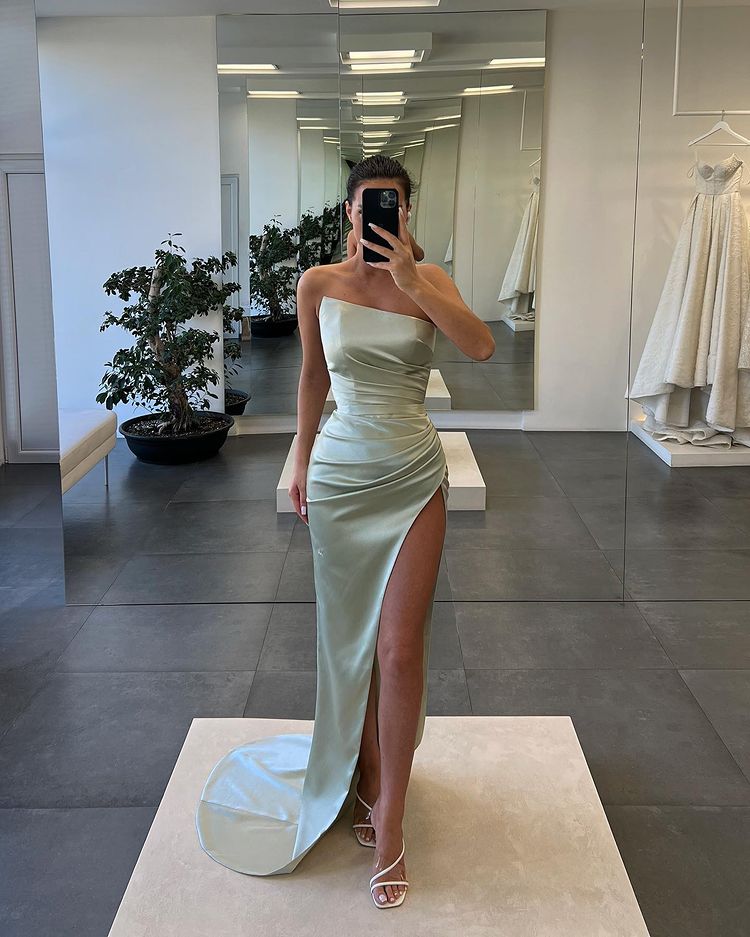 Fashion Elegant Mermaid Satin Prom Dress with High Slit, Sage Green Prom Dresses