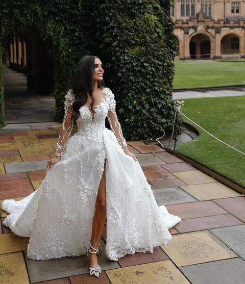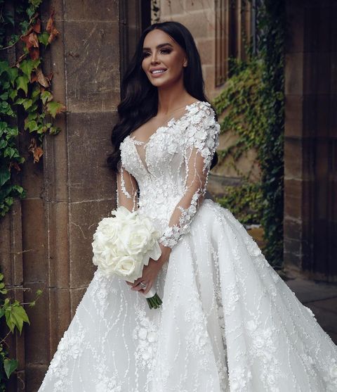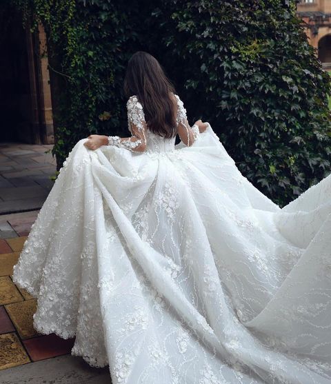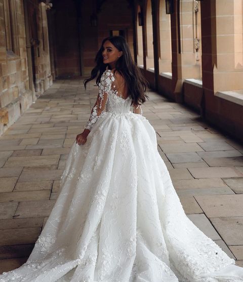 Luxurious Ball Gown V Neck Long Sleeves Lace Wedding Dresses