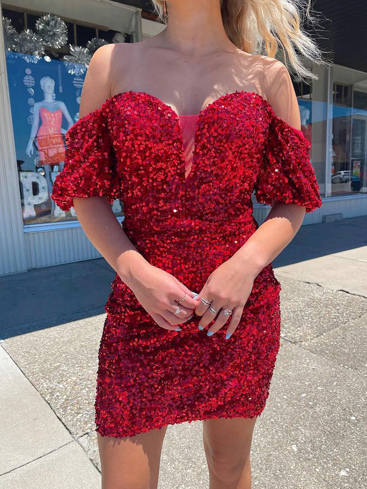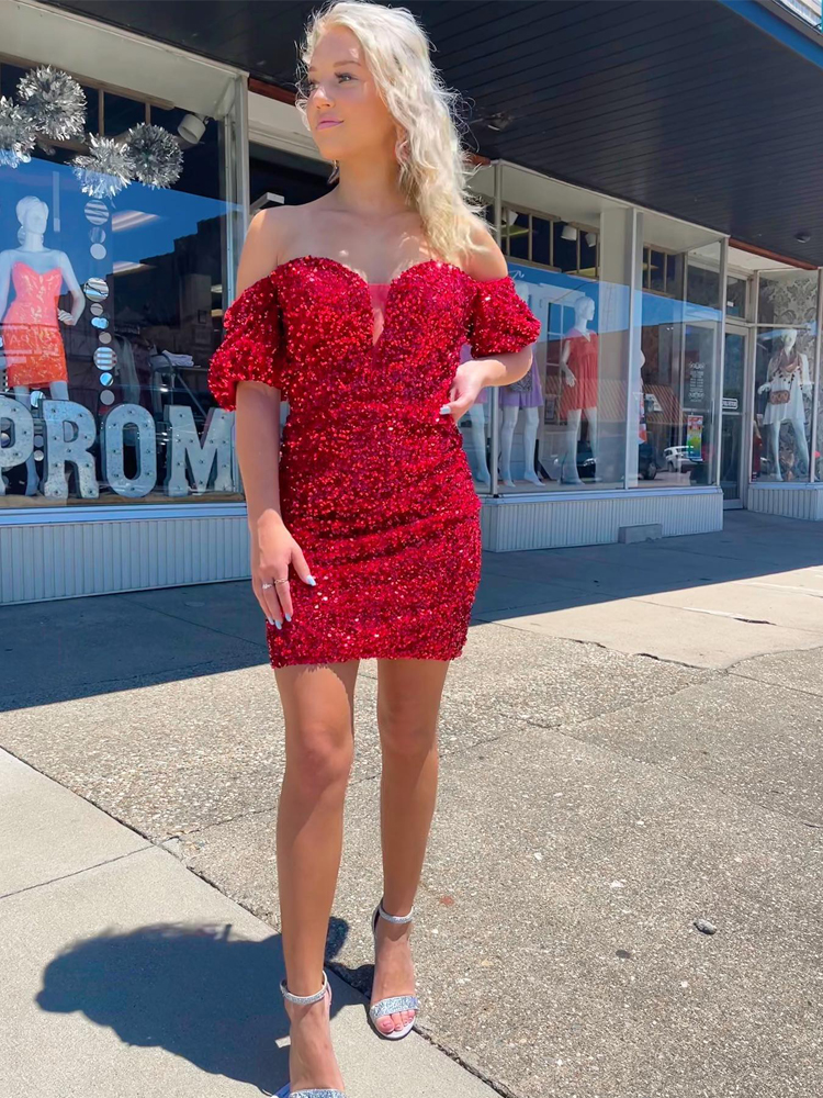 Red Sequins Off the Shoulder Short Homecoming Dresses