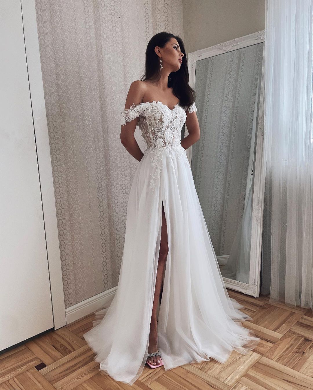 Charming A Line Off the Shoulder Tulle Wedding Dresses with Appliques