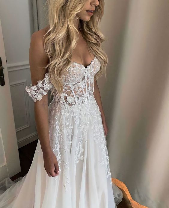Cute A Line Lace Tulle Wedding Dresses with Slit