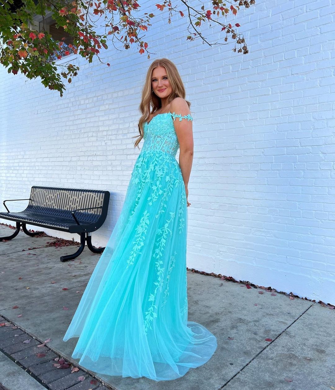 Cute A Line Sweetheart Teal Tulle Prom Dresses with Appliques