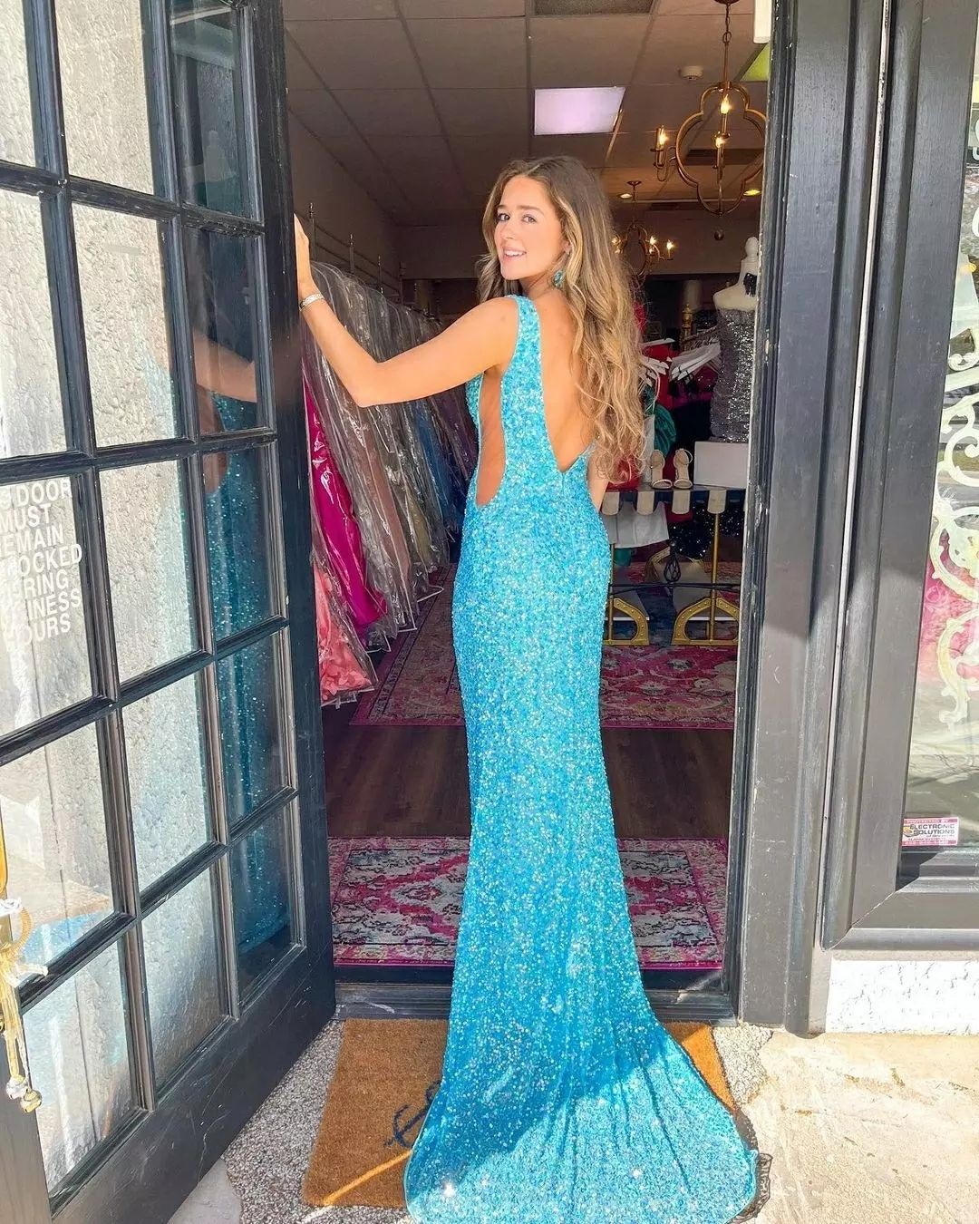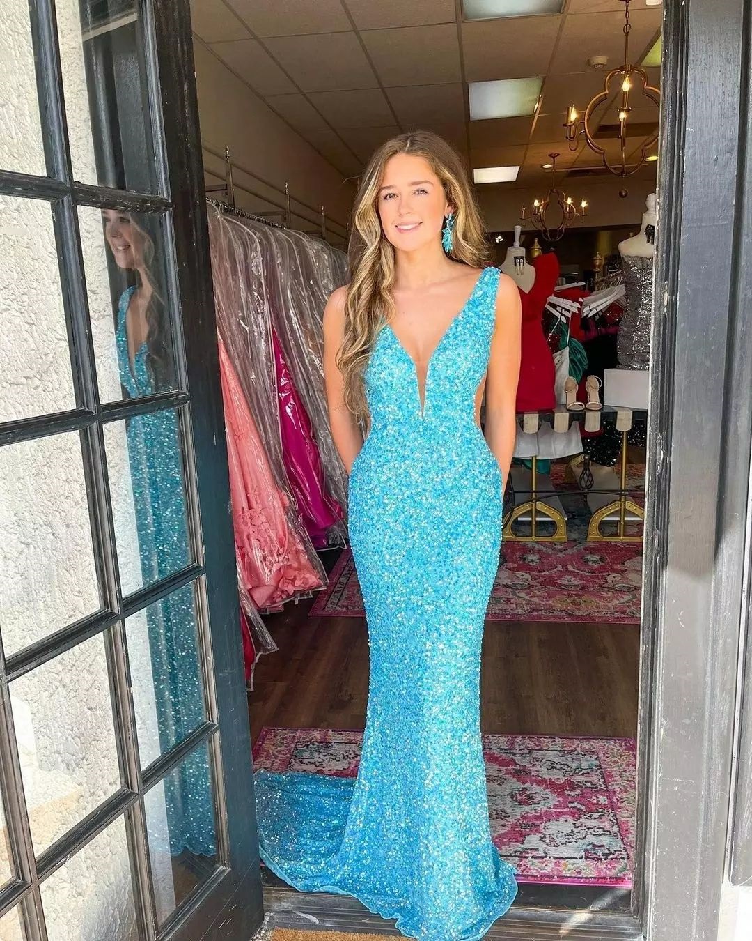 Cute Mermaid V Neck Blue Sequins Long Prom Dresses